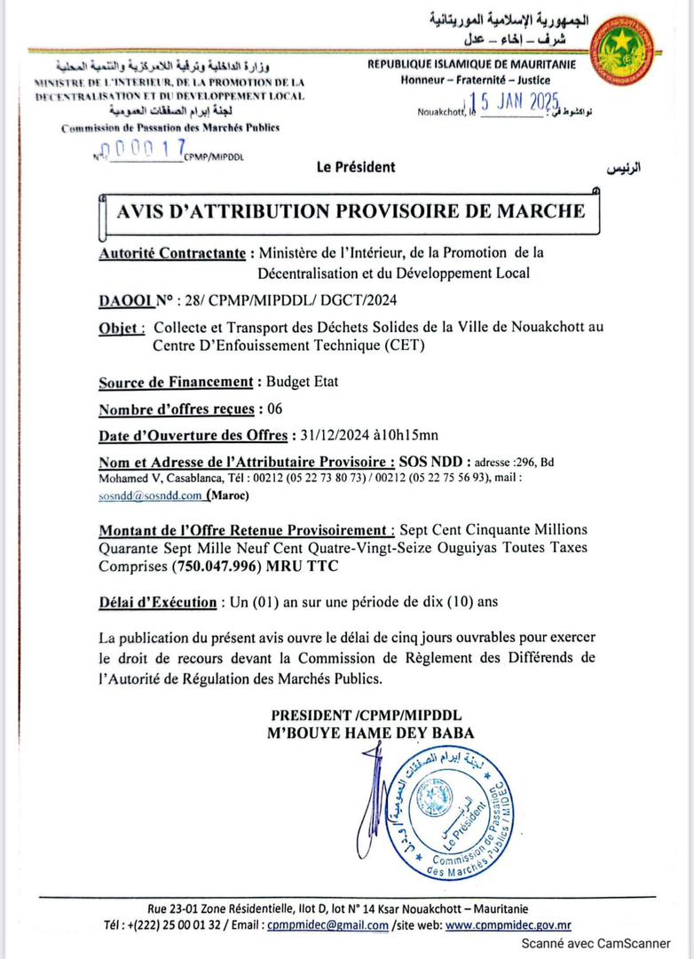 الأخبار (نواكشوط) – فازت شركة SOS NDD المغربية بصفقة نظافة العاصمة نواكشوط، وذلك مقابل مبلغ 7.5 مليار أوقية قديمة.