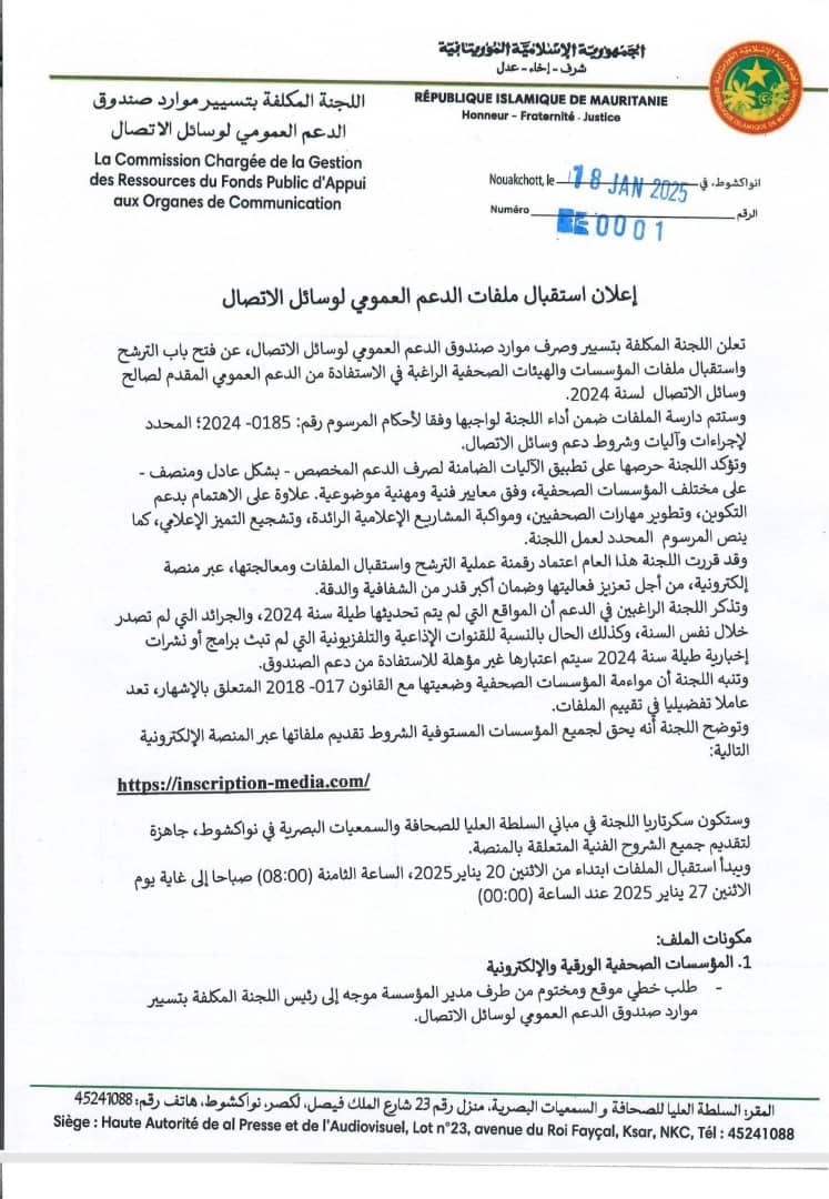 الأخبار (نواكشوط) – أعلنت اللجنة المكلفة بتسيير وصرف موارد صندوق الدعم العمومي لوسائل الاتصال، عن فتح باب الترشح واستقبال ملفات المؤسسات والهيئات الصحفية الراغبة في الاستفادة من الدعم العمومي المقدم الصالح وسائل الاتصال لسنة 2024، وحددت شروط الاستفادة من الدعم.