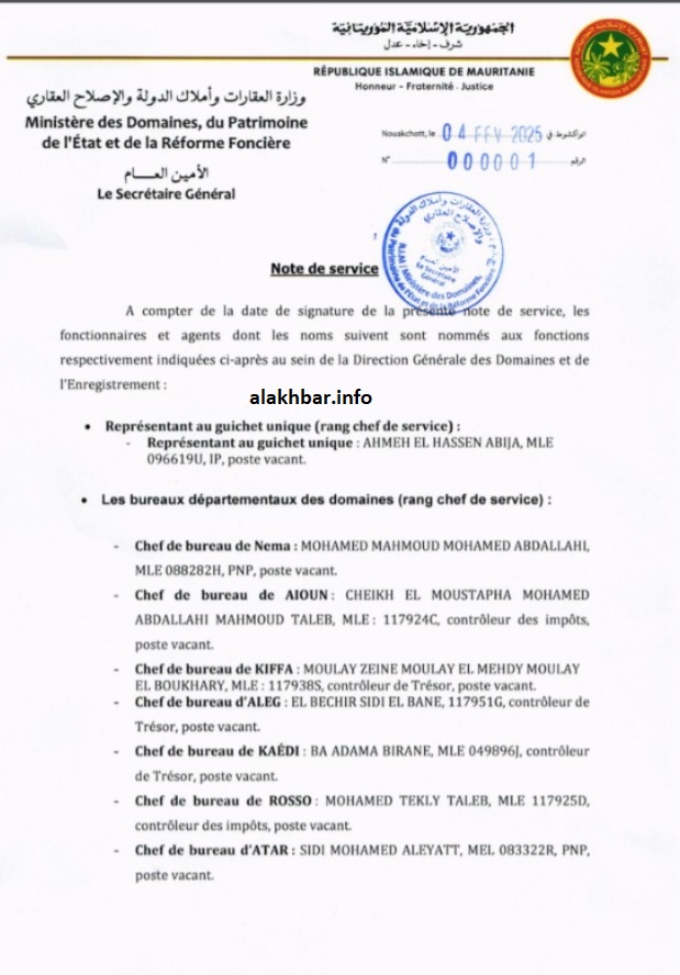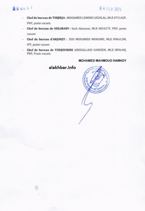 الأخبار (نواكشوط) – ألغت وزارة العقارات وأملاك الدولة والإصلاح العقاري اليوم الخميس المذكرة رقم 00001، الصادرة بتاريخ الثلاثاء 04 فبراير 2025، والتي بموجبها تم تعيين عدد من موظفي الوزارة من بينهم متهم بالاحتيال والتزوير.