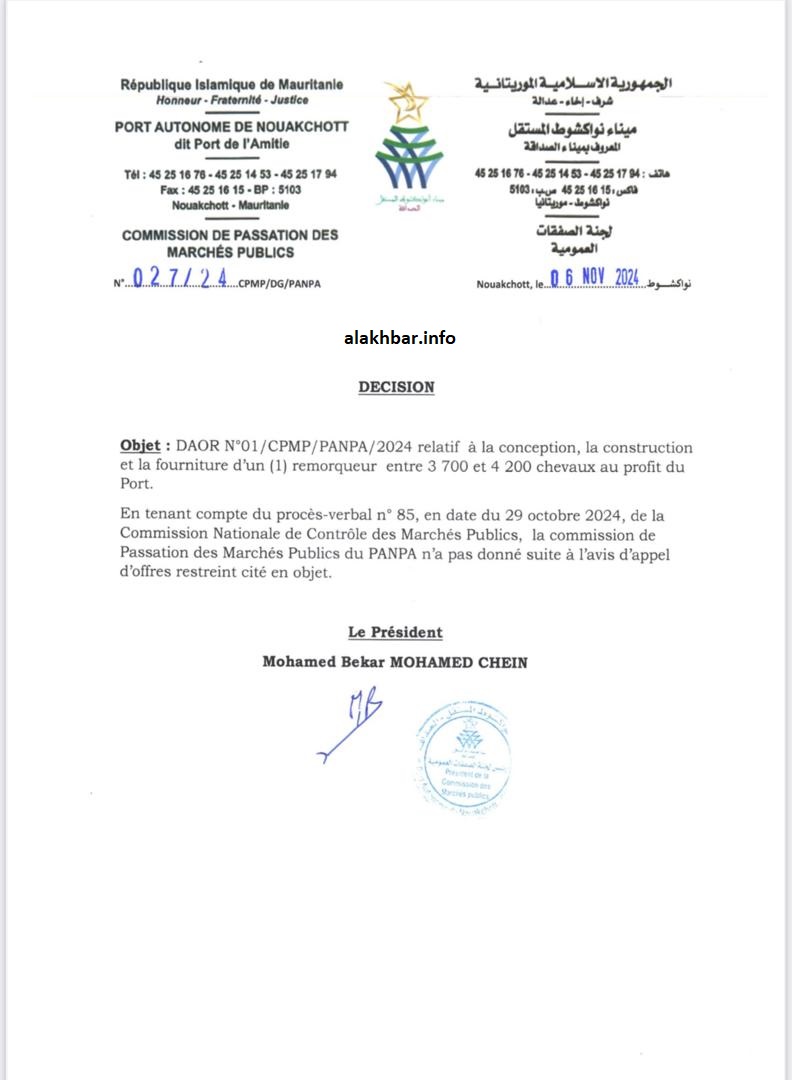 وفي نوفمبر 2024، عادت لجنة الصفقات العمومية في ميناء نواكشوط المستقل لتعلن للمرة الثالثة عن مناقصة، ولترفع مجددا قوة القاطرة المطلوبة من 3700 إلى 4200 إلى 4000 إلى 5000 حصان.