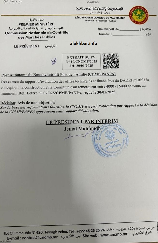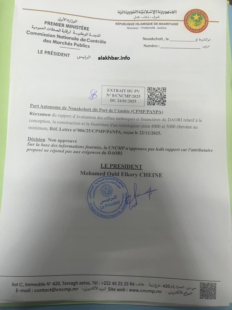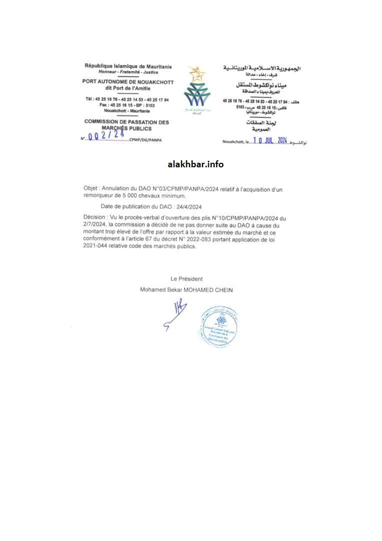 الأخبار (نواكشوط) – منحت لجنةُ الصفقات العمومية في ميناء نواكشوط المستقل يوم 31 يناير المنصرم صفقة توريد قاطرة بحرية لشركة UZmar التركية، كانت في الرتبة الثالثة بين الشركات التي تنافست عليها، وتقدّمت بأغلى سعر.