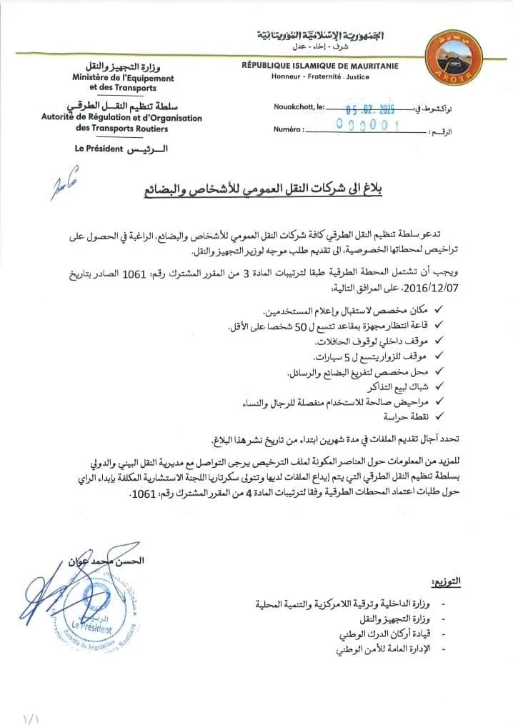 الأخبار(نواكشوط) – حددت سلطة تنظيم النقل الطرقي شروط الحصول على تراخيص للمحطات الخصوصية لكافة شركات النقل في بلاغ صادر عنها أمس الجمعة.