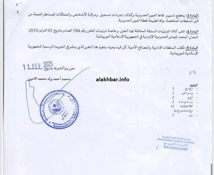 ونص المقرر في مادته الثانية على أن المعابر الثنائية مفتوحة حصرا أمام المواطنين الموريتانيين ورعايا الدولة المقابلة، وفقا للاتفاقيات المطبقة والقوانين والنظم المعمول بها بهذا الخصوص.