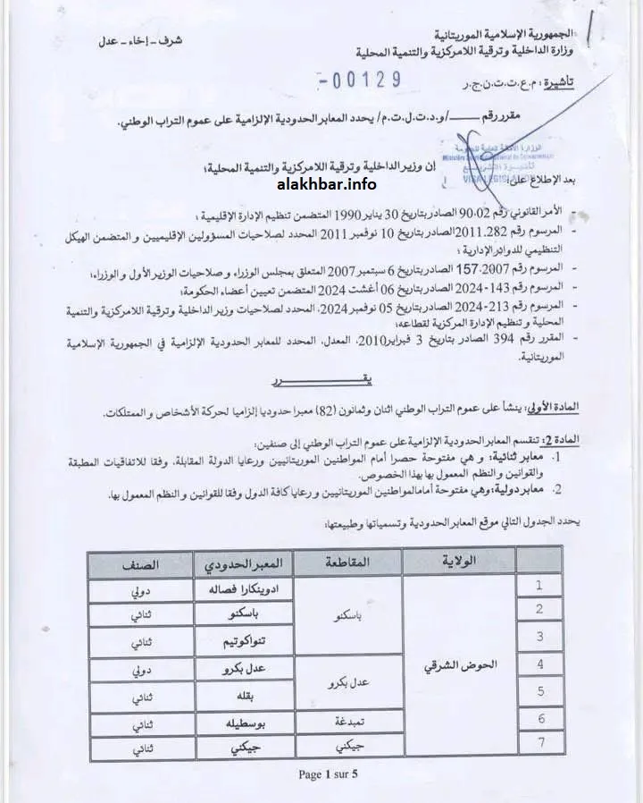 الأخبار (نواكشوط) – وقع وزير الداخلية وترقية اللا مركزية والتنمية المحلية محمد أحمد ولد محمد الأمين مقررا حدد بموجبه 82 منفذا حدوديا إلزاميا، من بينها 20 منفذا دوليا، و62 منفذا ثنائيا مع دول الجوار.