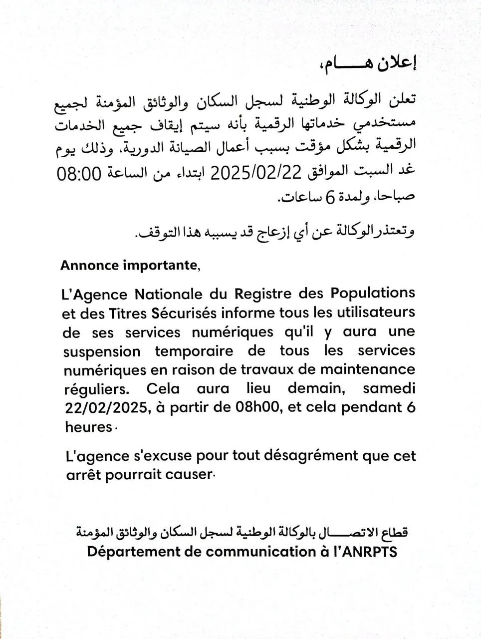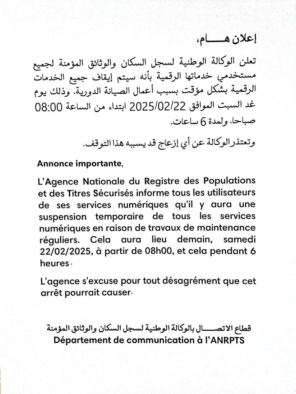 الأخبار (نواكشوط) – أعلنت الوكالة الوطنية لسجل السكان والوثائق المؤمنة عن توقف مؤقت لخدماتها الرقمية، ابتداءً من الساعة 08:00 من يوم السبت 22 فبراير، لمدة 6 ساعات.