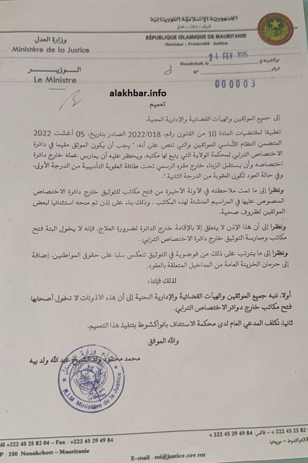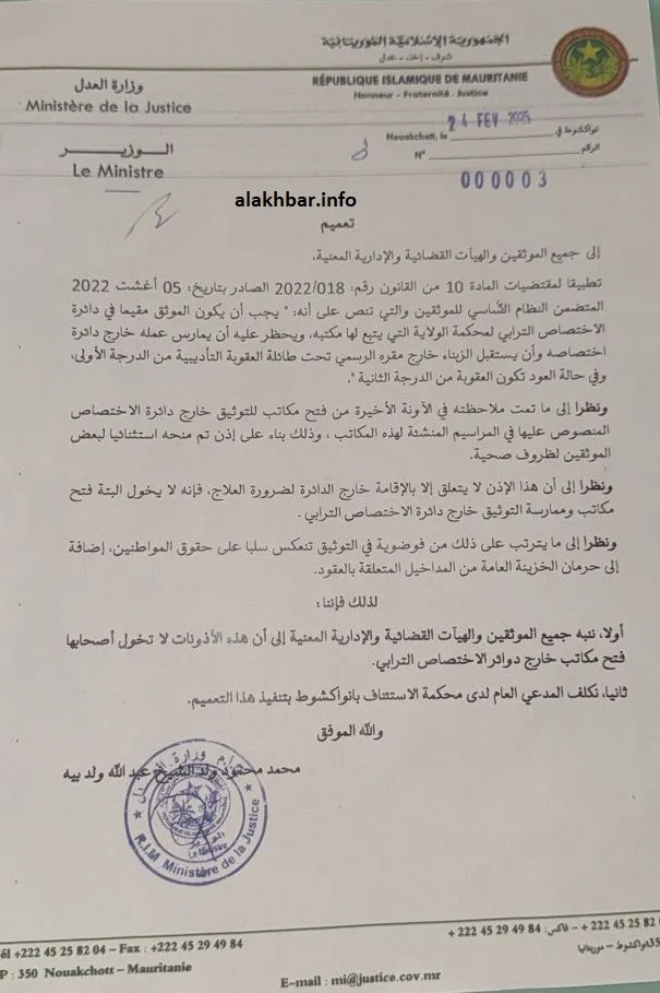 ونبهت الوزارة في تعميم وقعه الوزير محمد محمود ولد بيه جميع الموثقين والهيئات القضائية والإدارية المعنية إلى أن الأذونات الممنوحة لا تخول أصحابها فتح مكاتب خارج دوائر الاختصاص الترابي.