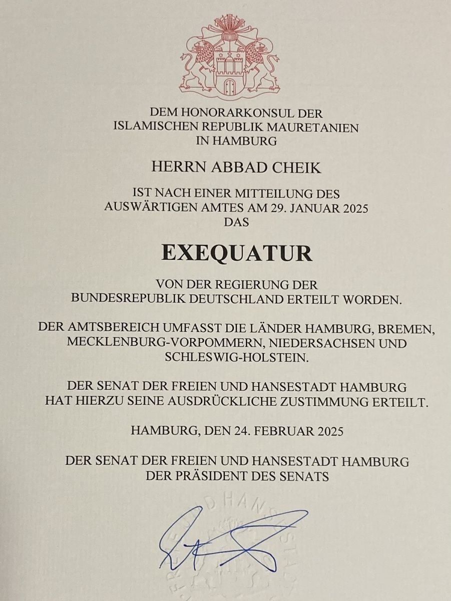 الأخبار (نواكشوط) – اعتمدت ألمانيا عباد ولد الشيخ المصطفى قنصلا شرفيا لموريتانيا في هامبورج والولايات الألمانية الشمالية، حيث تسلم وثيقة بذلك من السلطات الألمانية.