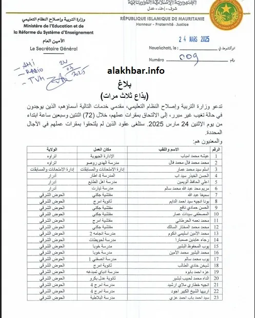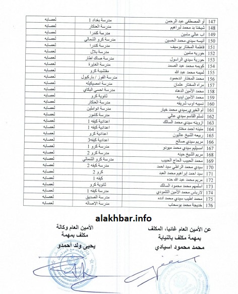 ووقّع البلاغ عن وزارة التربية وإصلاح النظام التعليمي، الأمين العام بالنيابة المكلف بمهمة مكلف، محمد محمود اسيادي، والأمين العام وكالة لوزارة الثقافة والاتصال والعلاقات مع البرلمان، المكلف بمهمة يحيى ولد أحمدو.