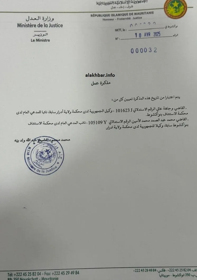 الأخبار (نواكشوط) – وقّع وزير العدل محمد محمود ولد بيه اليوم مذكرة عمل، حوّل بموجبها وكيل الجمهورية في ولاية آدرار وجاها عالي نائبا للمدعي العام لدى محكمة الاستئناف بنواكشوط.