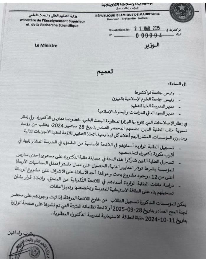 وكانت وزارة التعليم العالي والبحث العلمي قد أصدرت في 21 مارس الماضي تعميما لمديري مؤسسات جامعة نواكشوط وجامعة العلوم الإسلامية بالعيون، والمدرسة العليا للتعليم، والمعهد العالي للدراسات والبحوث الإسلامية بتسجيل الطلبة الموجهين لمدارسها، وكذلك تسوية وضعية الطلبة المتظلمين على مستوى مدرسة كلية العلوم والتقنيات.