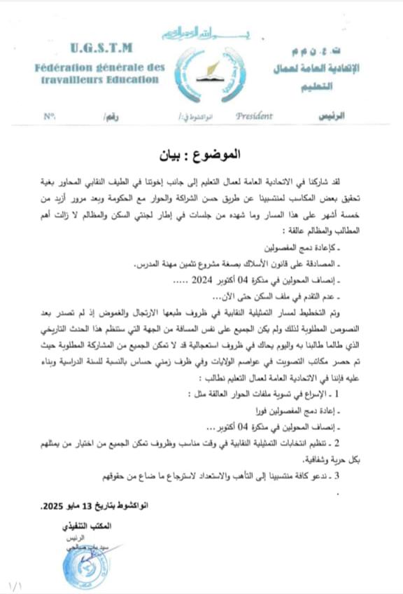 وأوضحت الاتحادية في بيان لها، أنّ من بين تلك المطالب إعادة دمج المفصولين، والمصادقة على قانون الأسلاك بصيغة مشروع تثمين مهنة المدرس، مع إنصاف المحولين في مذكرة 04 أكتوبر 2024، و عدم التقدم في ملف السكن حتى الآن، وفقا للاتحادية.