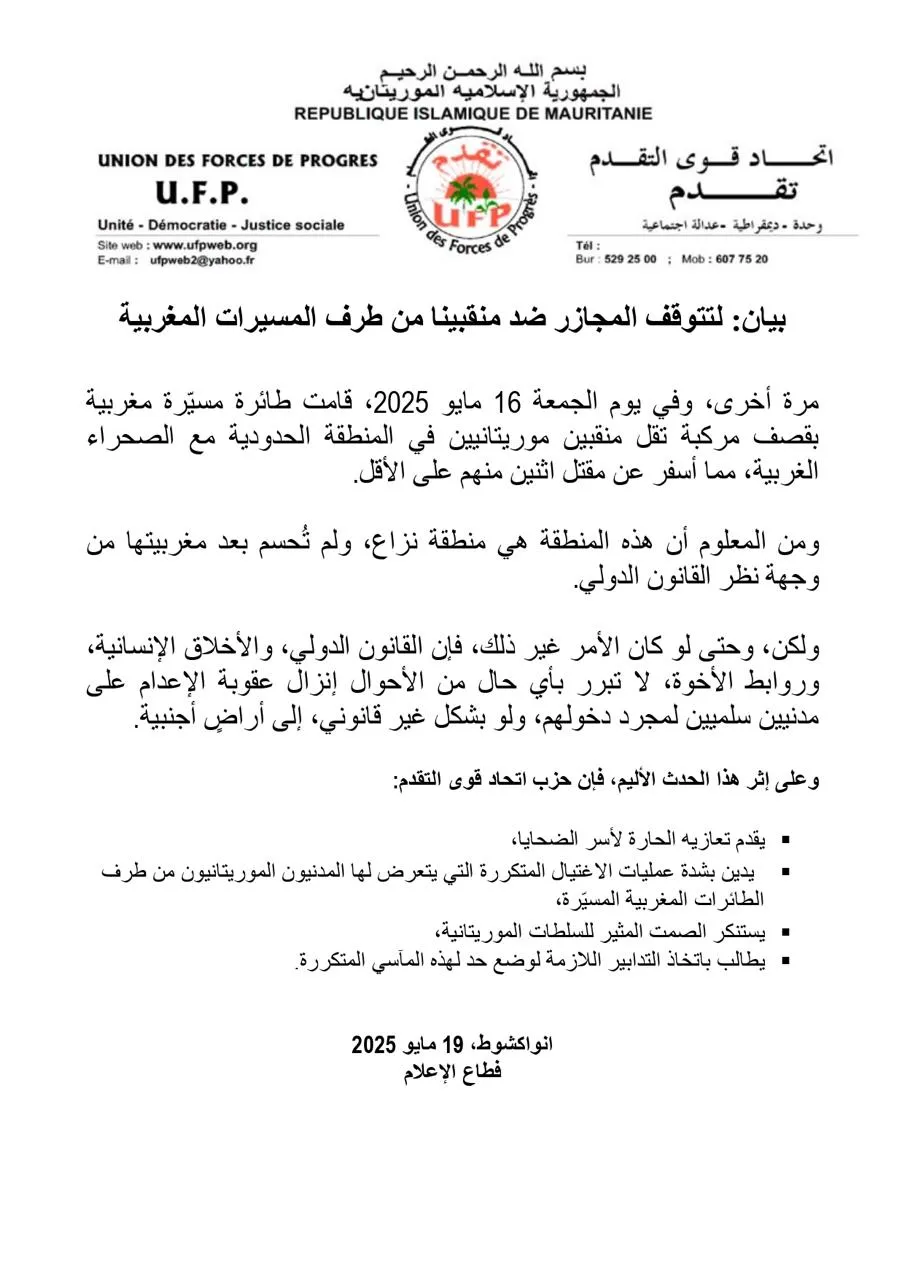 الأخبار (نواكشوط) – استنكر حزب اتحاد قوى التقدم الصمت المثير للسلطات الموريتانية، عقب الاغتيالات المتكررة التي يتعرض لها المدنيون الموريتانيون من طرف الطائرات المغربية المسيرة على الحدود.