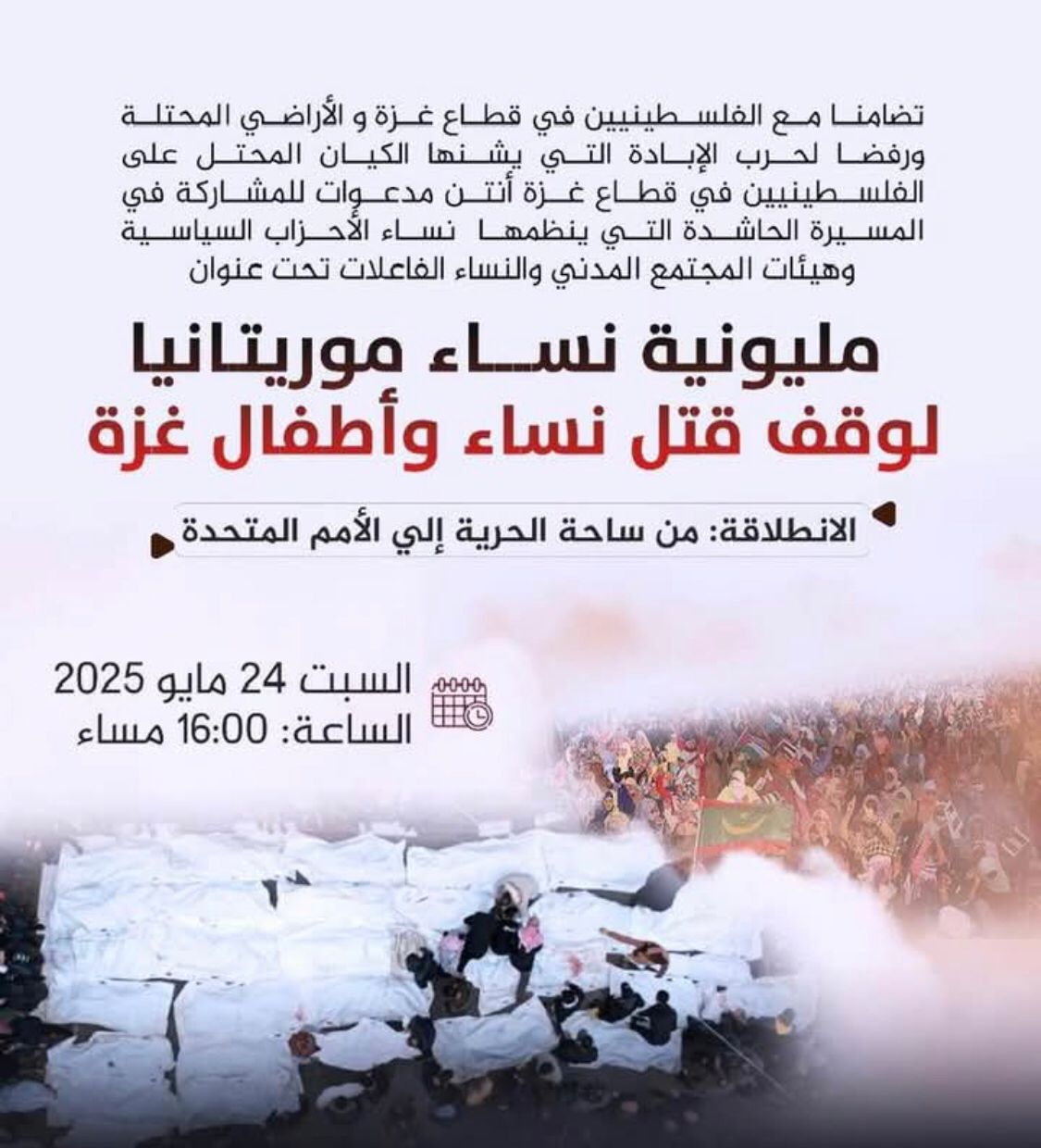 الأخبار(نواكشوط) – دعت عدة منظمات وفعاليات نسائية سياسية ومجتمعية إلى مسيرة مليونية مساء السبت دعما لسكان غزة.
