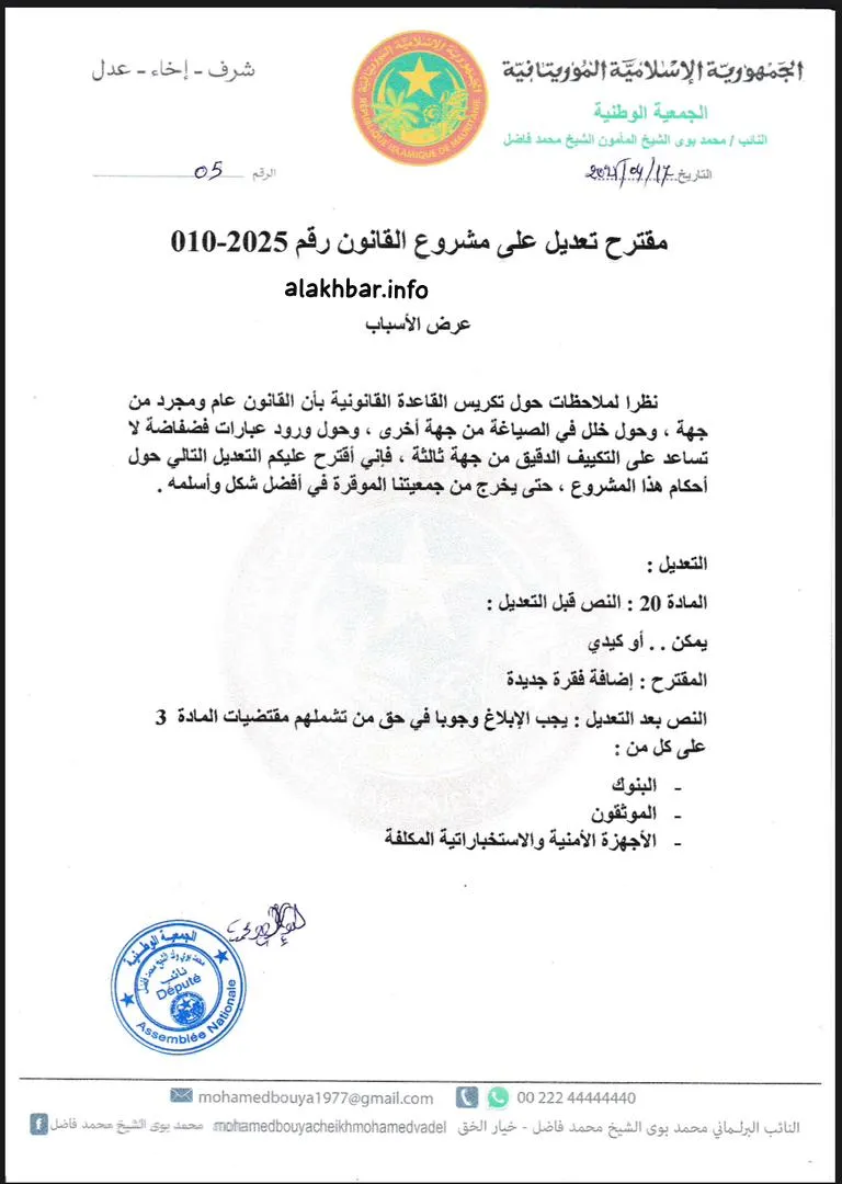 وقُدم نص التعديل على مشروع القانون رقم: 2025-010 المتعلق بالتصريح بالممتلكات والمصالح، من طرف النائب محمد بوي ولد الشيخ محمد فاضل، وتلاه نيابة عنه النائب محمد الأمين سيدي مولود.