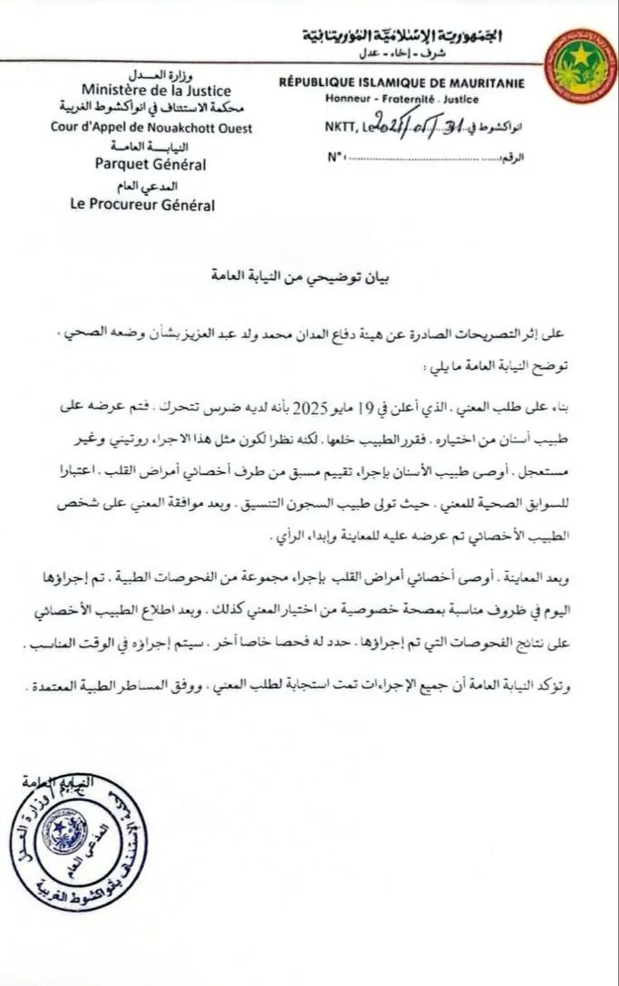 الأخبار (نواكشوط) – قالت النيابة العامة بولاية نواكشوط الغربية إن المدان محمد ولد عبد العزيز خضع لإجراءات طبية اليوم كانت كلها استجابة لطلبه ووفق المساطر المعتمدة.