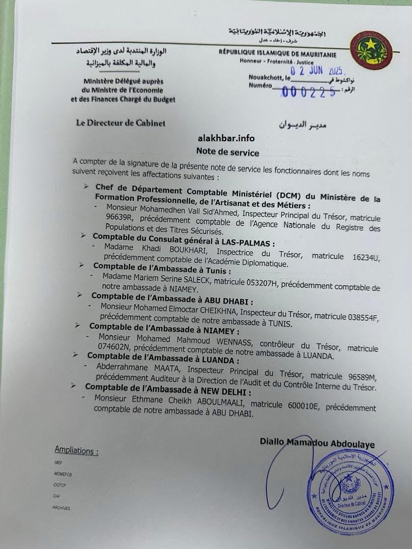 وبموجب هذه المذكرة التي وقعها مدير ديوان الوزير المنتدب جالو ممادو عبدولاي، وحملت الرقم: 0225 بتاريخ: 02 يونيو 2025، تم إجراء التغييرات التالية: