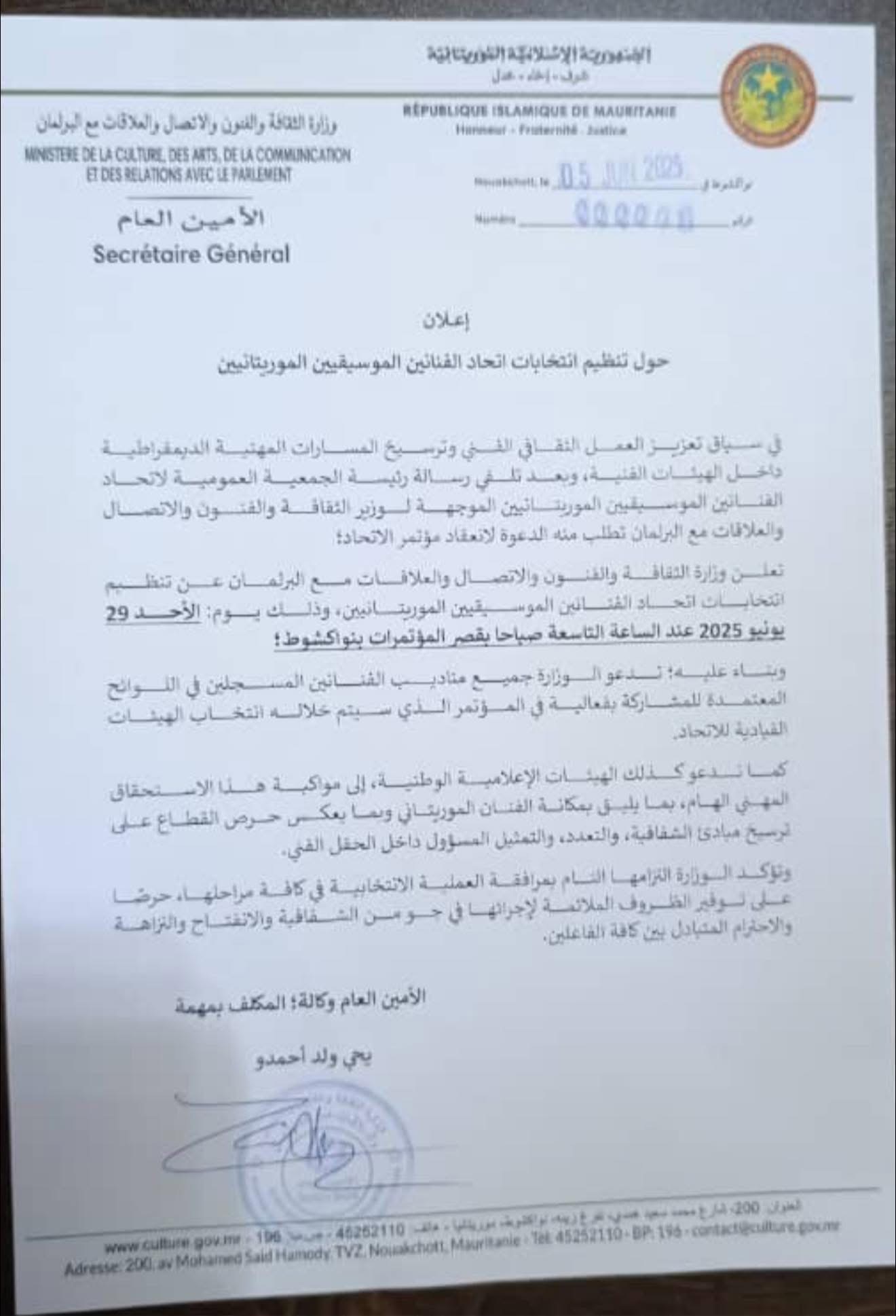 الأخبار (نواكشوط) – أعلنت وزارة الثقافة والفنون والاتصال والعلاقات مع البرلمان عن تحديد 29 من يونيو الجاري لتنظيم انتخابات اتحاد الفنانين الموسيقيين الموريتانيين، وذلك بقصر المؤتمرات في نواكشوط.