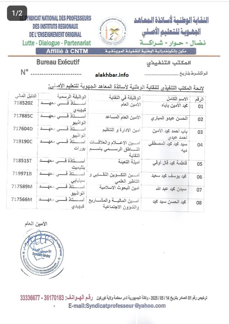 الأخبار (نواكشوط) – أعلن أساتذة المعاهد الجهوية للتعليم الأصلي عن تأسيس نقابة خاصة بهم تحت اسم “النقابة الوطنية لأساتذة المعاهد الجهوية للتعليم الأصلي”، مؤكدين أنها حصلت خريص يحمل الرقم: 001، بتاريخ: 14/05/2025 عن وكالة الجمهورية لدى محكمة ولاية كوركل.