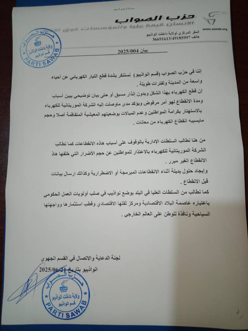 الأخبار (نواذيبو) – استنكر قسم حزب الصواب بمدينة نواذيبو انقطاعات التيار الكهربائي لساعات طويلة بدون إنذار مسبق، أو حتى بيان توضيحي يبين أسباب ومدة الانقطاع.