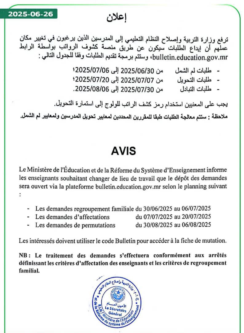 الأخبار (نواكشوط) – حددت وزارة التربية وإصلاح النظام التعليمي آجال التبادل للم الشمل العائلي، والتحويل، والتبادل، للمدرسين الذين يرغبون في ذلك تحضيرا للسنة الدراسية القادمة.