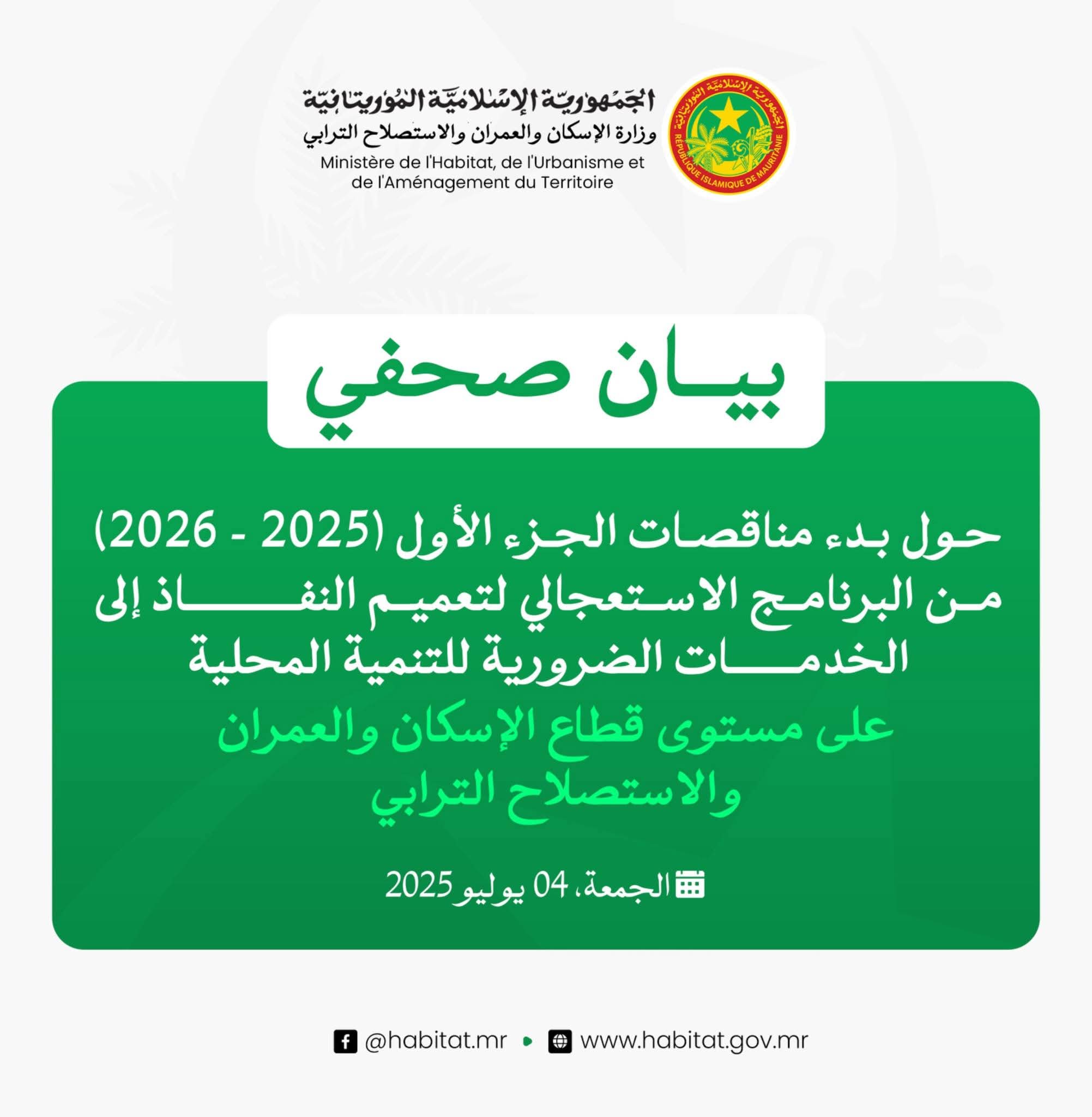 الأخبار (نواكشوط) – أعلنت وزارة الإسكان والعمران والاستصلاح الترابي عن بدء مناقصات لإنجاز مشاريع صحية وتعليمية، مدرجة ضمن الجزء الأول (2025 – 2026) من البرنامج الاستعجالي لتعميم النفاذ إلى الخدمات الضرورية للتنمية المحلية.