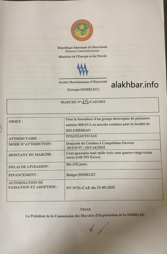 وبلغت قيمة الصفقة 148 ألف أورو (نحو 688 مليون أوقية) وذلك بهدف اقتناء مولد تبلغ طاقته 800KVA لحل أزمة الكهرباء في بلغربان.
