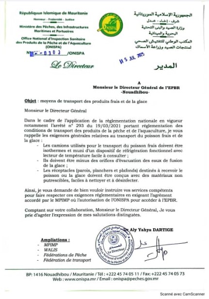 الأخبار(نواذيبو)- أعلن المكتب الوطني للتفتيش الصحي لمنتجات الصيد وتربية الأحياء المائية شروطا جديدة في وسائل نقل المنتجات الطازجة والثلج.