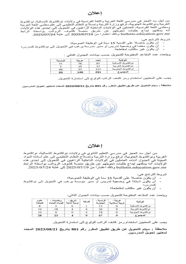 كما اشترطت للمعلمين أن يكونوا حاصلين على أقدمية 15 سنة في الوظيفة، وغير مكتتبين لمقاطعة، وأن يكون الراغب في التحويل في وضعية تدريس أو مدير مدرسة يرغب في التحويل إلى نواكشوط.