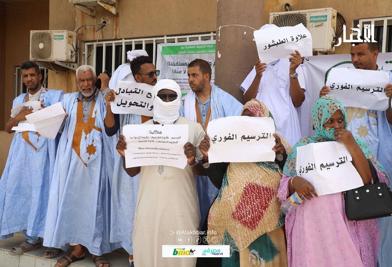 الأخبار (نواكشوط) – نظم مقدمو خدمات التعليم، صباح اليوم الخميس، وقفة احتجاجية أمام مباني وزارة التربية وإصلاح النظام التعليمي، للمطالبة بترسيمهم ضمن الطاقم التربوي الرسمي.