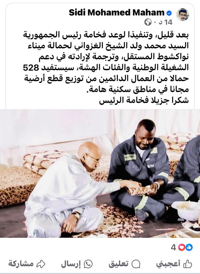وقال ولد محم في منشور عبر منصة “إكس” إن 528 حمالا من العمال الدائمين بالميناء سيستفيدون من توزيع قطع أرضية مجانا.