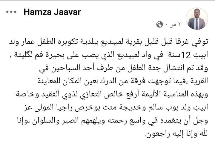 وغرق الطفل ولد ابيب في واد لمبيديع الذي يصب في بحيرة فم لكليتة، وفق ما أكده عمدة بلدية تكوبرة حمزة جعفر في تدوينة على حسابه في فيسبوك.