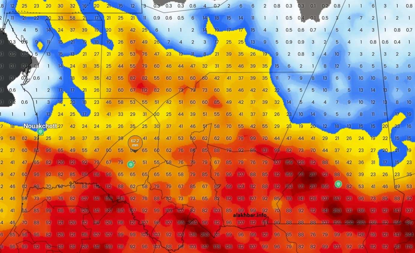 الأخبار (نواكشوط) – يتوقع بحول الله تعالى أن يشهد الأسبوع القادم موجة أمطار هي الأكثر غزارة وانتشارا خلال موسم الأمطار الحالي حتى الآن، حيث ستغطي غالبية التراب الوطني.