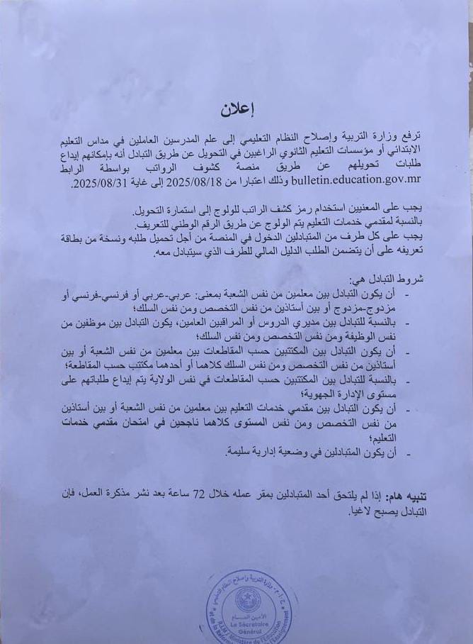 الأخبار (نواكشوط) – أعلنت وزارة التربية وإصلاح النظام التعليمي عن فتح باب التبادل بين المدرسين، وذلك عن طريق منصة كشوف الرواتب اعتبارا من 18 أغسطس 2025 إلى غاية 31 أغسطس 2025.
