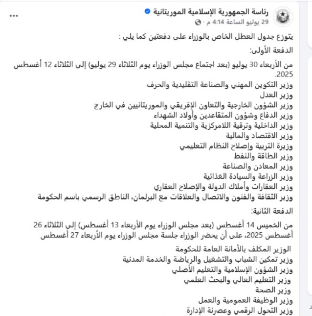 وكتبت صفحة الرئاسة في المنشور حينها أن الدفعة الثانية من الحكومة تبدأ عطلتها “من الخميس 14 أغسطس (بعد مجلس الوزراء يوم الأربعاء 13 أغسطس) إلى الثلاثاء 26 أغسطس 2025، على أن يحضر الوزراء جلسة مجلس الوزراء يوم الأربعاء 27 أغسطس”.