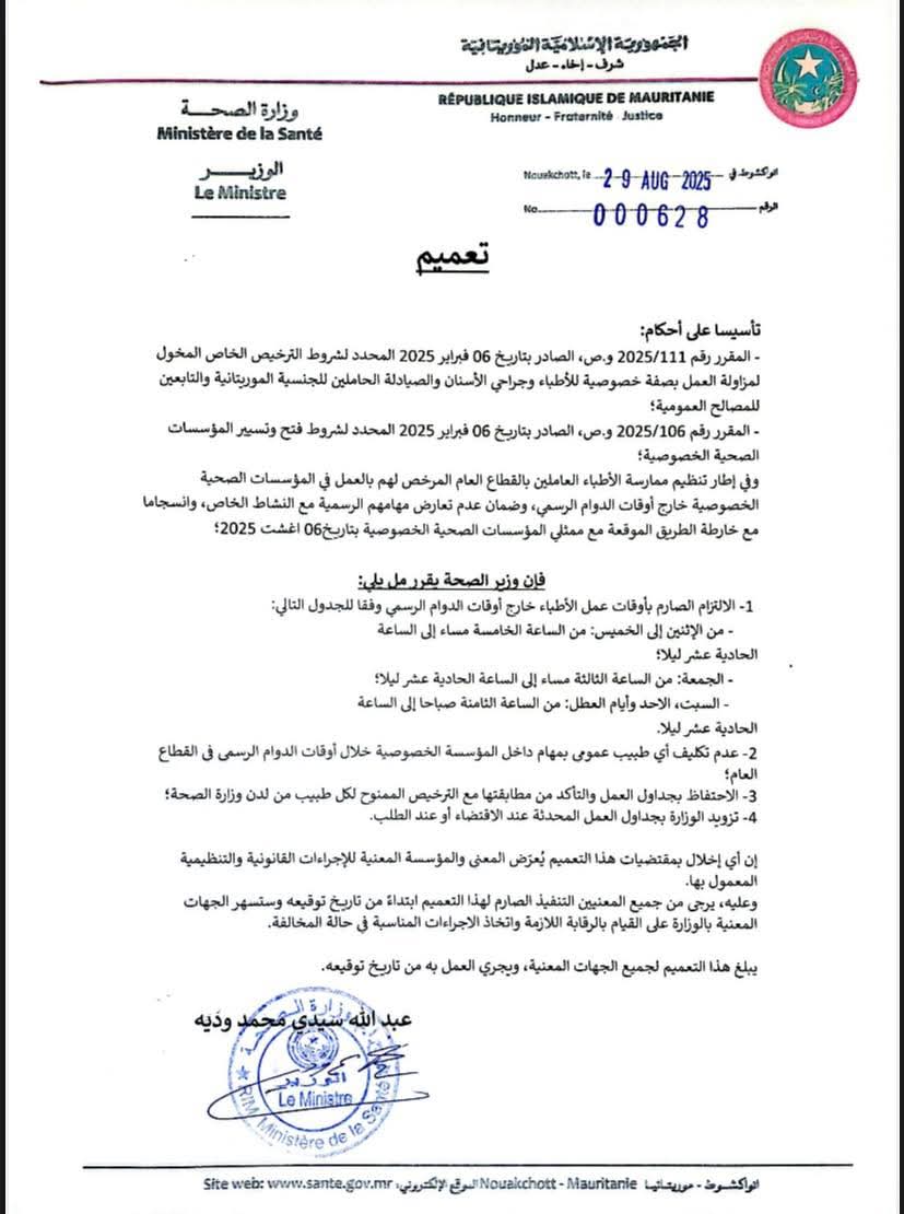 الأخبار (نواكشوط) – أعلنت وزارة الصحة عن جدول مداومة جديد للأطباء في العيادات الخاصة يحظر عليهم العمل ابتداء من الساعة الـ11 ليلا.