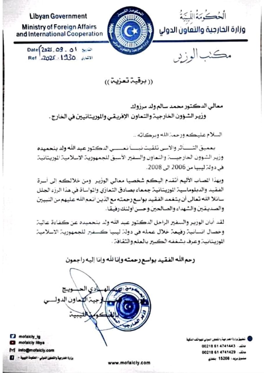وأضافت الخارجية الليبية أن الراحل أبان عن كفاءة عالية وخصال إنسانية رفيعة خلال عمله في دولة ليبيا كسفير للجمهورية الإسلامية الموريتانية، وعرف بشغفه الكبير بالعلم والثقافة.