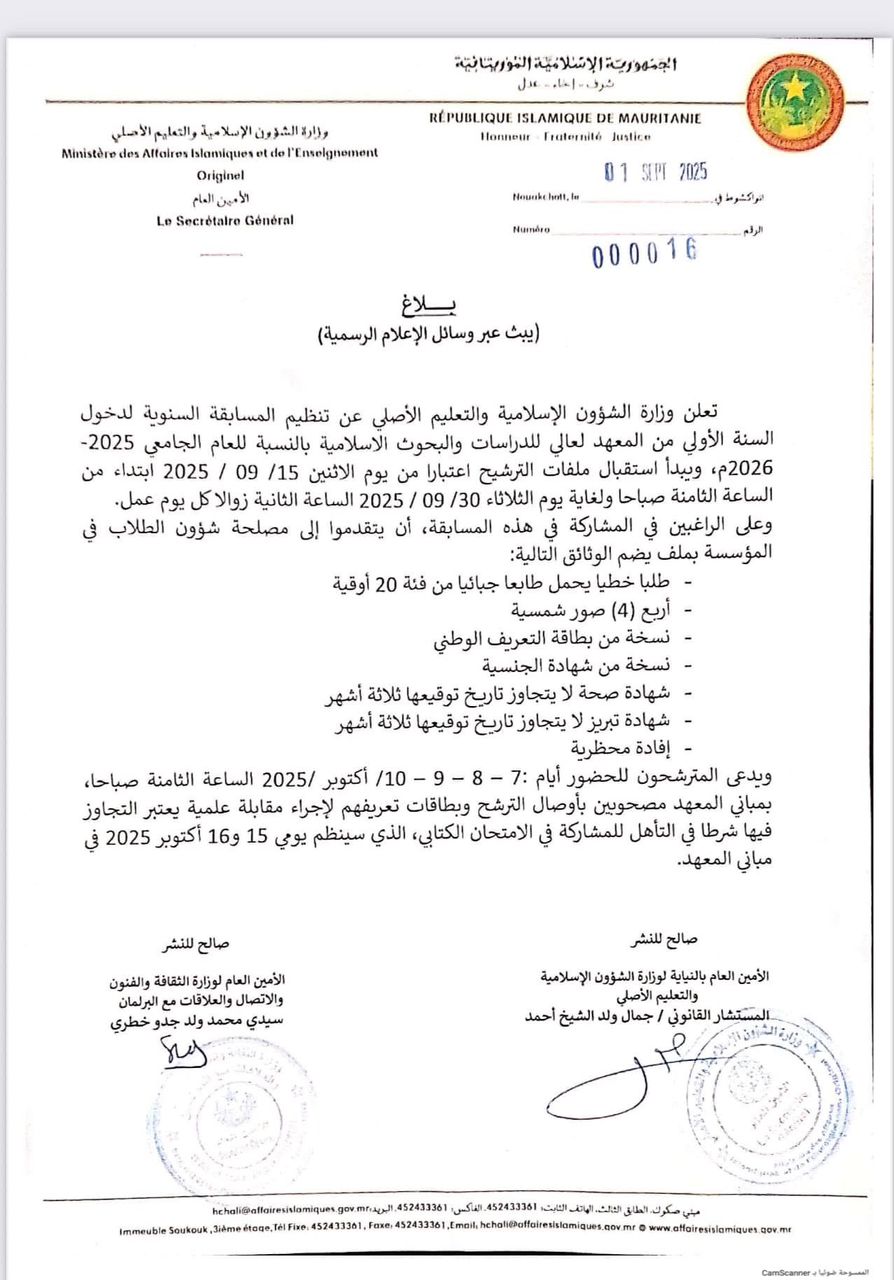 الأخبار (نواكشوط) – أعلنت وزارة الشؤون الإسلامية والتعليم الأصلي عن فتح باب الترشح للمسابقة السنوية لدخول السنة الأولى من المعهد العالي للدراسات والبحوث الإسلامية للعام الدراسي 2025 – 2026.