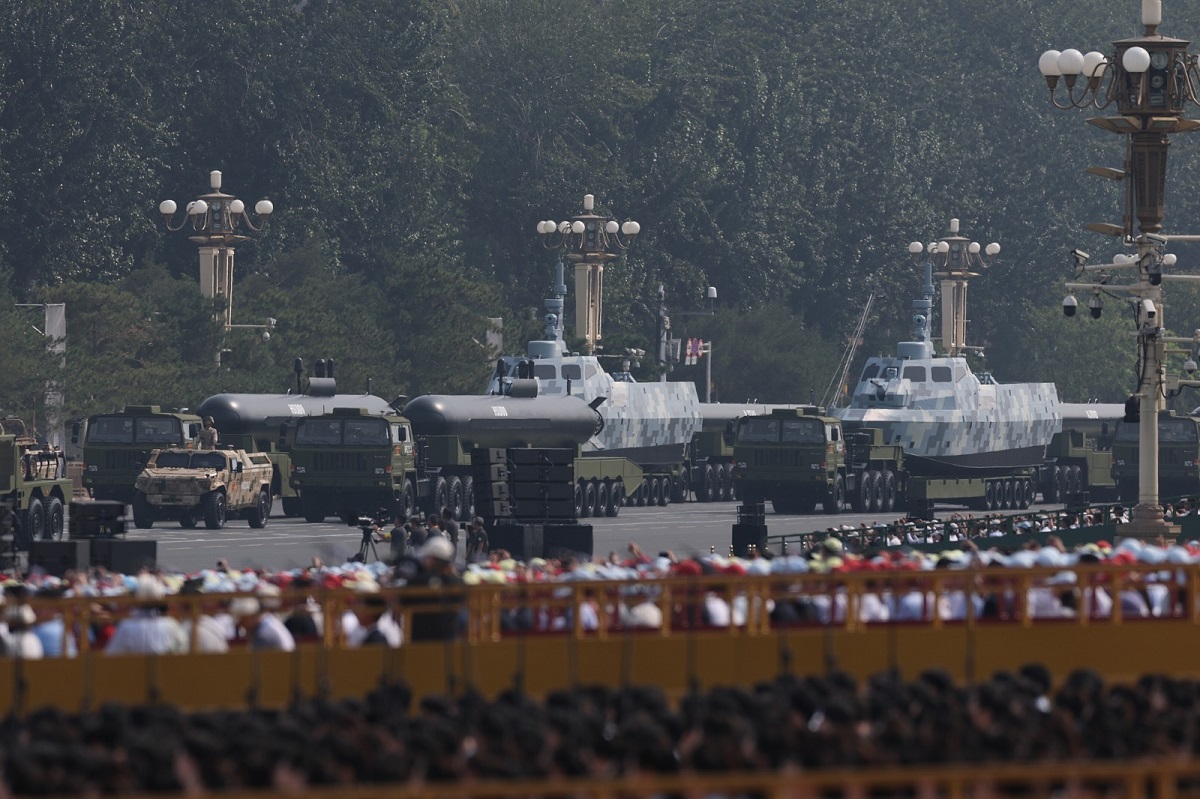 كما استعرضت صواريخ فرط صوتية ذات قدرات قتالية في أوضاع مختلفة، وهي من طرز “يينغجي – 21″، و”دونغفنغ – 17″، و”دونغفنغ – 26 دي”، فيما كشفت لأول مرة عن قواتها الاستراتيجية البرية والبحرية والجوية، باعتبارها “الثالوث” النووي، والذي يتألف من الصاروخ “جينغلي – 1” بعيد المدى الذي يطلق من الجو، والصاروخ العابر للقارات من طراز جيويلانغ – 3 الذي يطلق من الغواصات، والصاروخ العابر للقارات من طراز “دونغفنغ – 61″، والصاروخ الجديد العابر للقارات من طراز “دونغفنغ – 31″، وكلاهما يطلق من منصات أرضية.