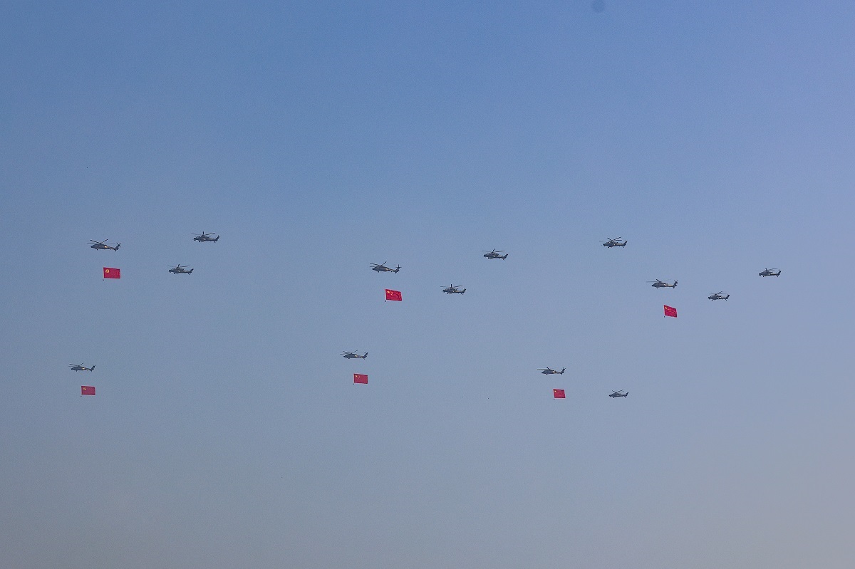 وحلقت فوق ساحة العرض طائرات مقاتلة من طرز “جيه – 16 دي” وجيه – 20 و”جيه – 35 أيه” و”جيه – 20 إس” و”جيه – 20 أيه”، كما حلقت طائرات مخصصة لحاملات الطائرات ضمن تشكيلين يضمان مقاتلات من طرز ” جيه – 15 دي إتش” و”جيه – 15 دي تي” و”جيه – 35″، و”جيه – 15 تي”، تبعها سرب من سبع طائرات استعراضية من طراز جيه – 10 إيذانا باختتام العرض العسكري.