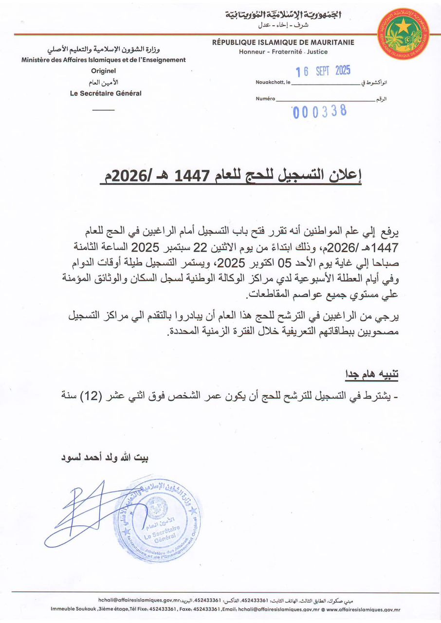 الأخبار (نواكشوط) – أعلنت وزارة الشؤون الإسلامية والتعليم الأصلي فتح باب التسجيل لقرعة الحج للعام 1447هـ، وذلك ابتداء من يوم الإثنين القادم.
