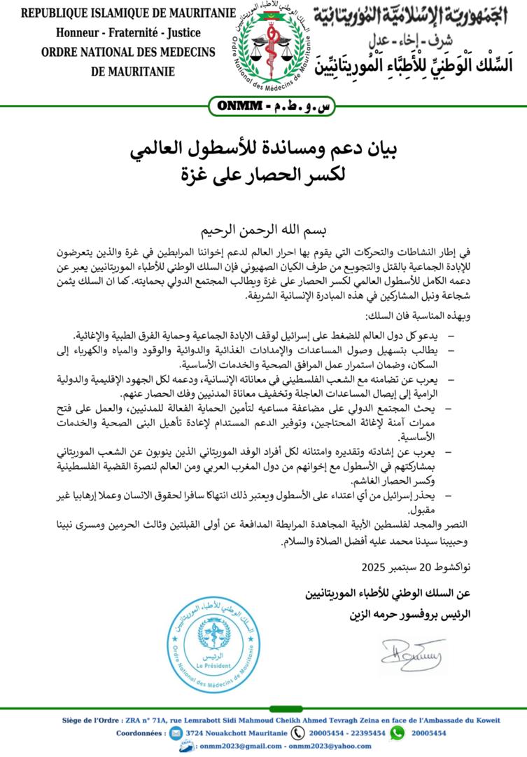 الأخبار (نواكشوط) – دعا السلك الوطني للأطباء الموريتانيين إلى تسهيل وصول المساعدات والإمدادات الغذائية والدوائية، والوقود، والمياه، والكهرباء إلى سكان غـ.ـزة عبر أسطول الصمود، مع ضمان استمرار عمل المرافق الصحية والخدمات الأساسية.