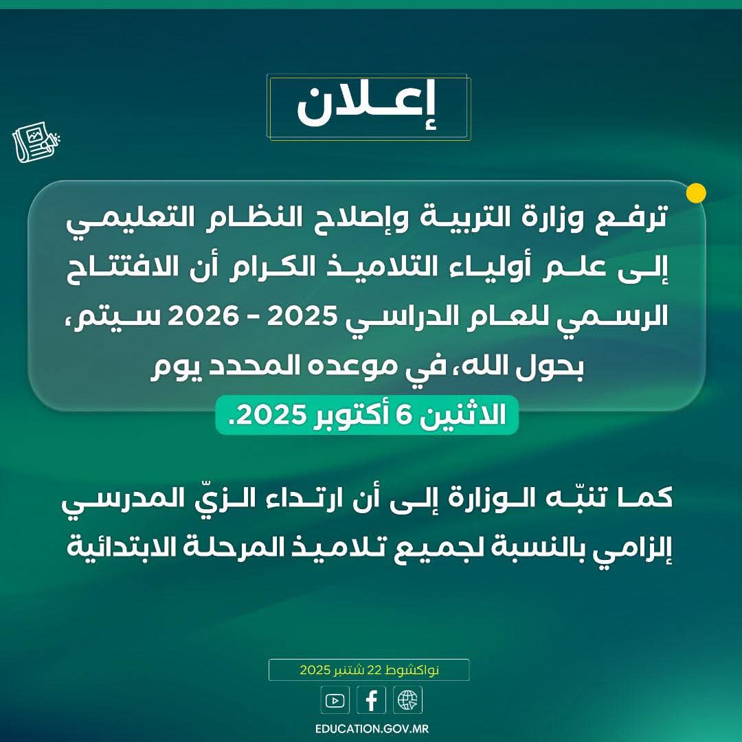الأخبار (نواكشوط) – أكدت وزارة التربية وإصلاح النظام التعليمي أن الافتتاح الرسمي للعام الدراسي 2025 – 2026 سيكون في موعده المحدد يوم الإثنين 6 أكتوبر 2025.