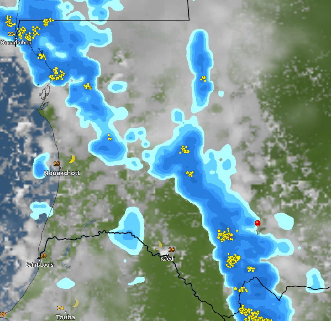 وقد بدأت هذه السحب في التحرك من الرابعة مساء وهي الآن توجد على الحوض الغربي، حيث يتوقع أن تكون أدت إلى تساقطات مطرية في المنطقة الممتدة من ولاتة شمالا وحتى جنوب تمبدغه غربا.