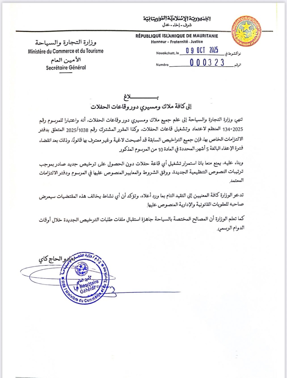 الأخبار (نواكشوط) – أعلنت وزارة التجارة والسياحة أن جميع تراخيص اعتماد وتشغيل قاعات الحفلات أصبحت لاغية، وغير معترف بها قانونا، وذلك بعد انتهاء فترة الإعفاء البالغة 5 أشهر، والتي منحت لهم بموجب المادة: 10 من المرسوم رقم: 134 – 2025.