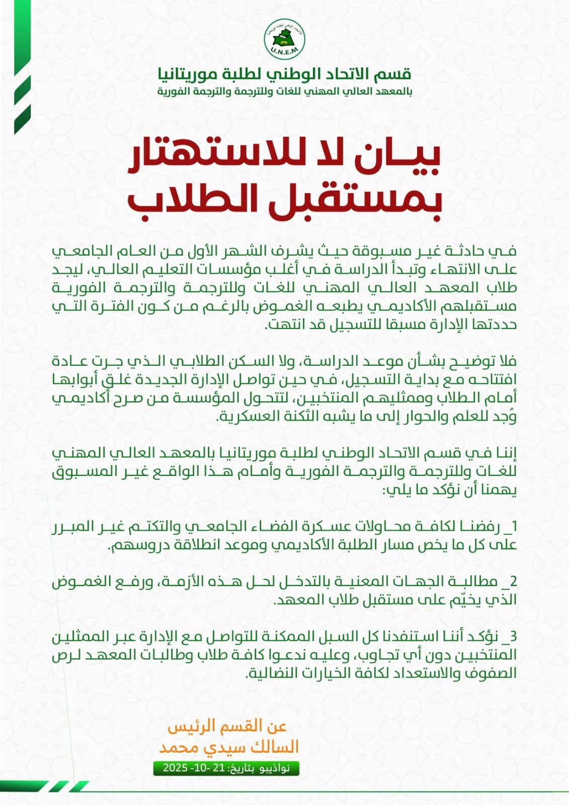 الأخبار (نواذيبو)- عبر الاتحاد الوطني لطلبة موريتانيا عن رفضه لما سماه عسكرة الفضاء الجامعي بالمعهد العالي المهني للغات والترجمة في نواذيبو “والتكتم غير المبرر على كل ما يخص مسار الطلبة الأكاديمي وقواعد انطلاقة الدراسة”.