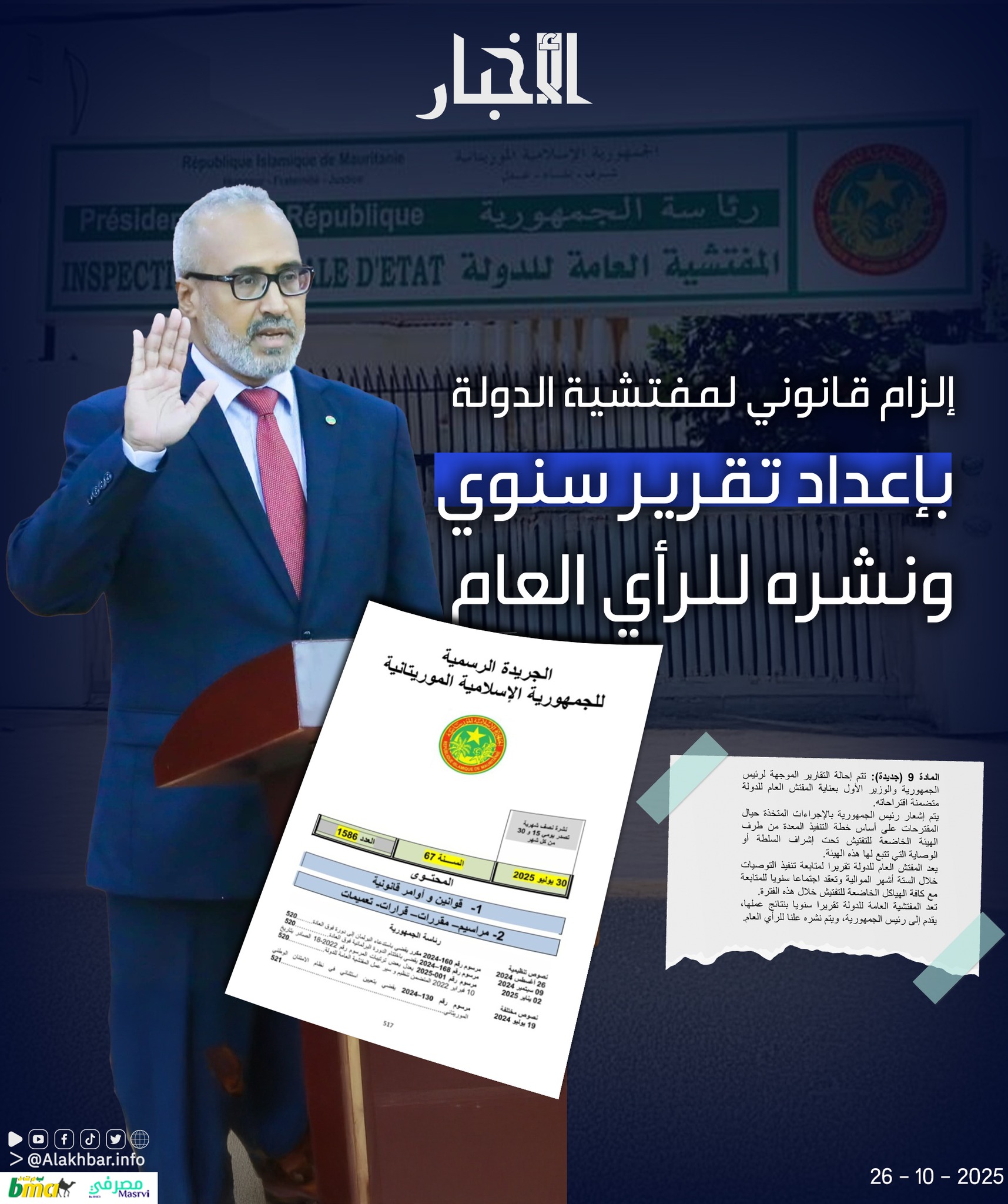 الأخبار (نواكشوط) – ألزم المرسوم رقم: 001 – 2025 الصادر يناير الماضي المفتشية العامة للدولة بإعداد تقرير سنوي بنتائج أعمالها، وتقديمه للرئيس، ونشره للرأي العام.