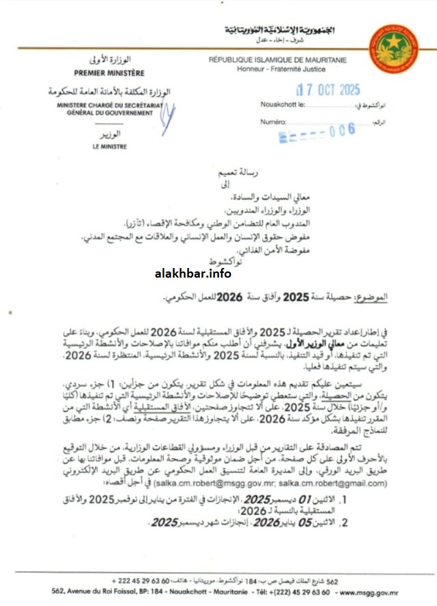 الأخبار (نواكشوط) – أمر الوزير الأمين العام للحكومة مختار حسينو لام أعضاء الحكومة ومن في رتبتهم بإعداد حصيلة بالإصلاحات والإنجازات التي قامت بها قطاعاتهم الحكومية خلال سنة 2025، وكذا آفاق عملهم للعام 2026.