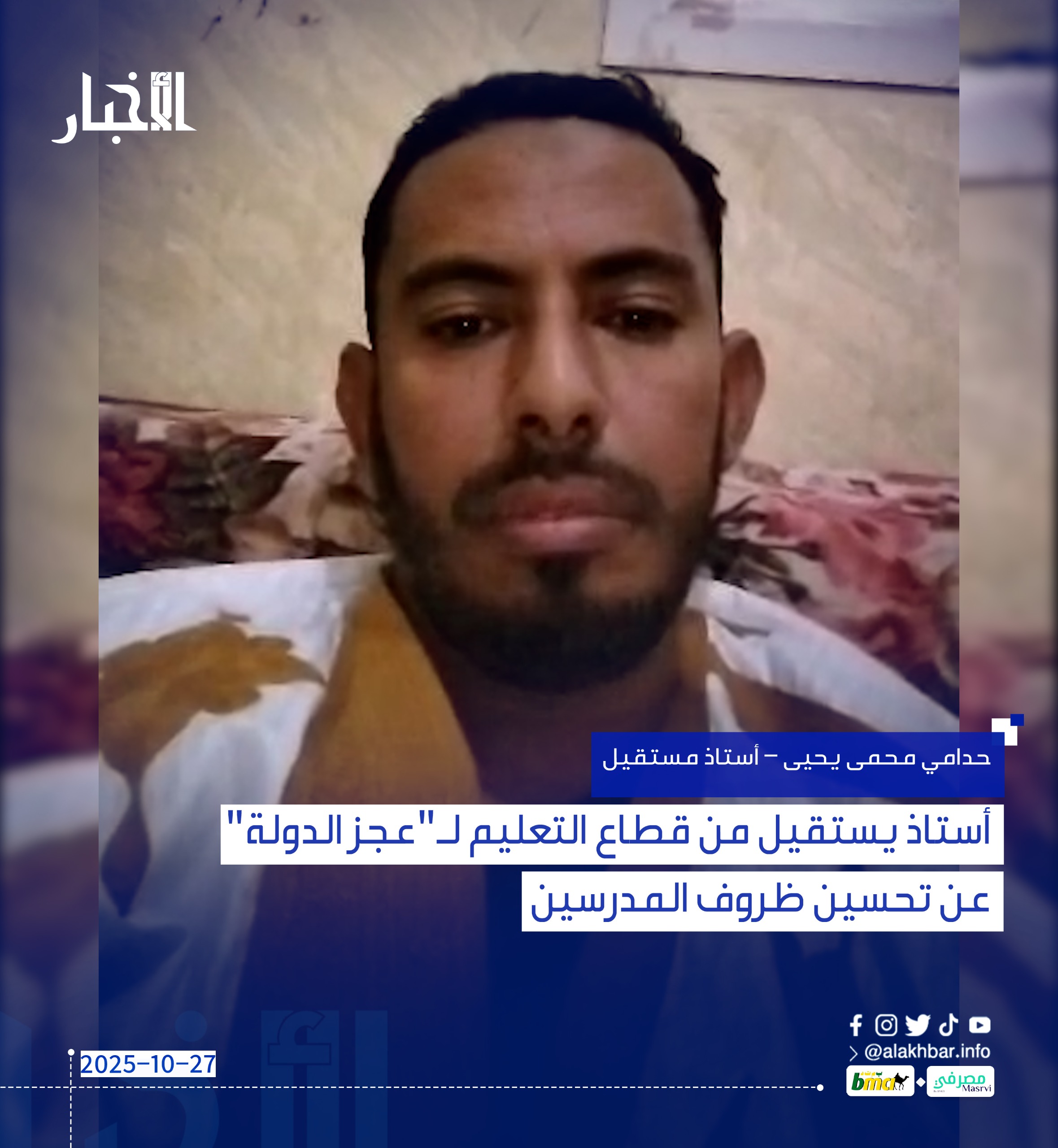 الأخبار (نواكشوط) – أعلن الأستاذ حدامي محمد يحيى استقالته من قطاع التعليم، ووصف المهنة بأنها تُساوي “احتقارًا” بفعل الراتب الذي لا يمكن صاحبه أن يسدد به إيجاره، ويُسير به عمله.