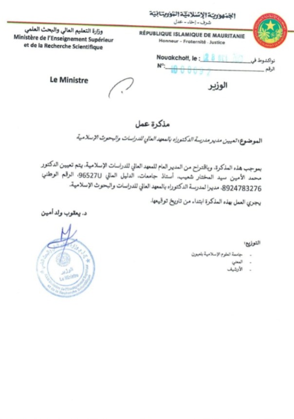وعيّن الوزير الدكتور محمد الأمين سيدي المختار شعيب رئيسا لمدرسة الدكتوراه في المعهد العالي، فيما عيّن الدكتور الشيخ أحمد نافع رئيسا لمدرسة الدكتوراه في الجامعة الإسلامية في العيون.