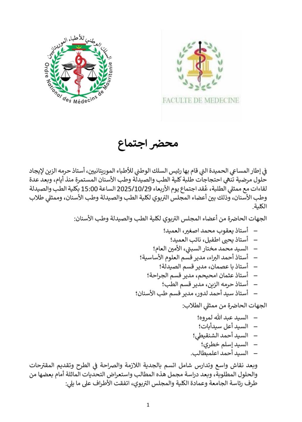 واتفقت الأطراف على تشكيل لجنة متابعة تضم رئيس السلك الوطني للأطباء الأستاذ حرمه الزين، وعميد كلية الطب الأستاذ يعقوب ولد محمد اسغير، وممثل طلاب شعبة الطب عبد الله لمروه، وممثل طلاب شعبة الصيدلة محفوظ سيدي باه، وممثل طلاب شعبة طب الأسنان محمد الأمين لعناية.